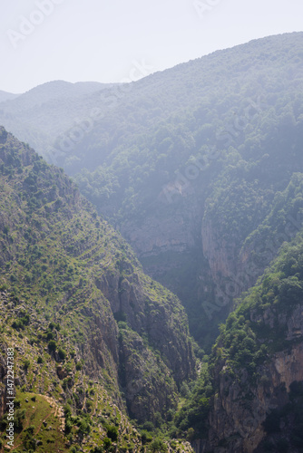 Naklejka premium Lush green mountain range with fog rolling through valleys. Scenic landscape...