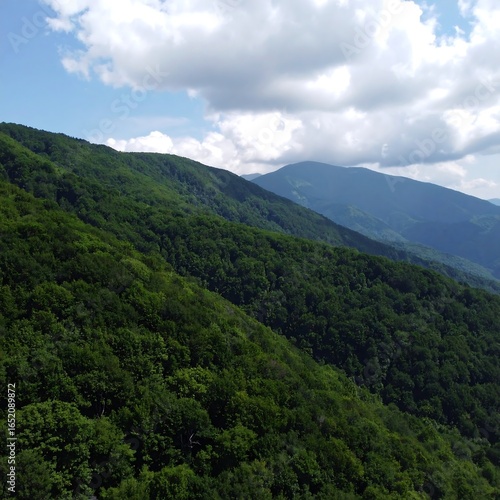 © Muk, Fototapeta premium Lush green mountain slope under a partly cloudy sky
