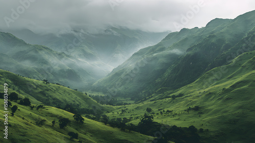 © fayyasin99, Fototapeta premium Lush green mountain valley landscape with foggy clouds scenery background