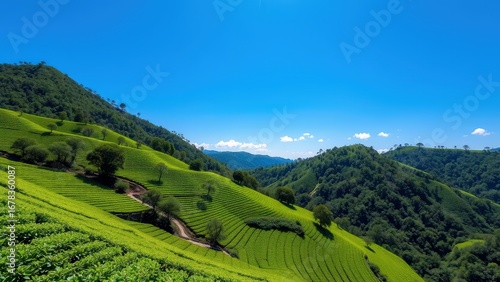 © YOASSATA, Fototapeta premium Lush green mountain view under clear blue sky