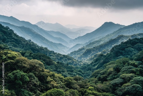 © saktiawan, Fototapeta premium Lush green mountains, misty valley