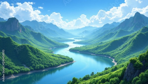 © NgoHong, Obraz premium Lush Green Mountains Surrounding a Winding River Under Cloudy Blue Skies