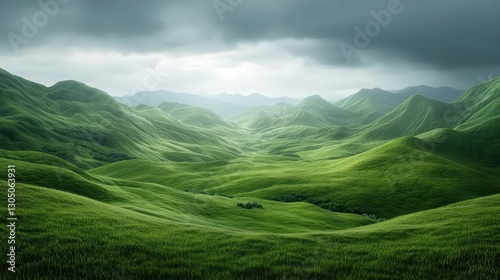 © Thanachart, Obraz premium Lush green mountains under a dramatic cloudy sky.