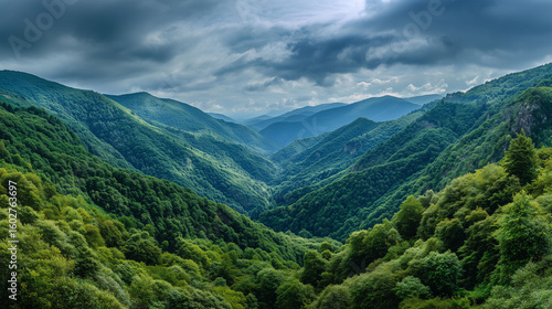 Fototapeta premium Lush green mountains with forest-covered slopes, daylight, partly cloudy sky,...