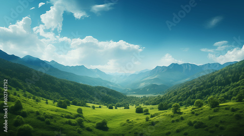 © Yoona, Fototapeta premium Lush green mountains with forest-covered slopes, daylight, partly cloudy sky, peaceful and fresh natural background