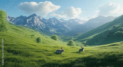 Obraz premium Lush Green Mountains with Rabbits Running.