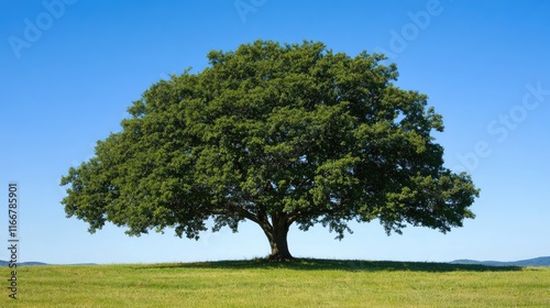 Fototapeta premium Lush Green Oak Tree Against Clear Blue Sky in Open Meadow
