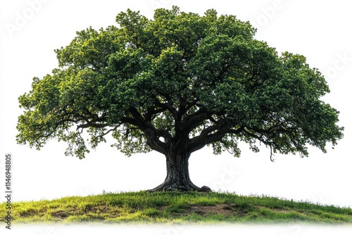 Fototapeta premium Lush green oak tree on a hilltop against a white background.