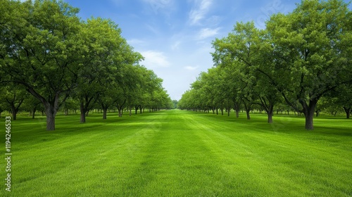 Naklejka premium Lush green orchard with symmetrical rows of trees under a clear blue sky,...