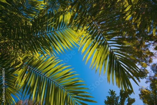 © MUHAMMAD ANIS, Fototapeta premium Lush Green Palm Fronds Against a Clear Blue Sky on a Sunny Day