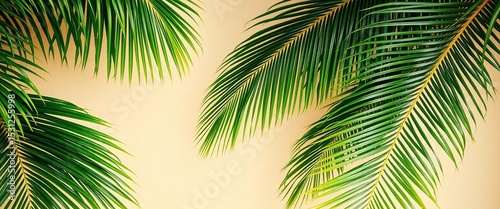 © Phitchaya, Obraz premium Lush green palm fronds create a tropical frame against a muted beige backdrop, nature background, summer background