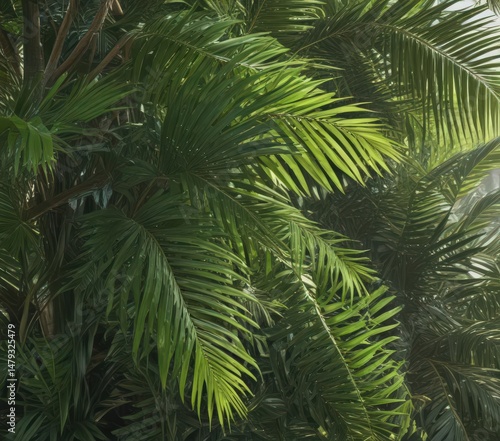 Fototapeta premium Lush green palm fronds, sunlight dappled, vibrant texture , nature, palm...