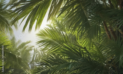 © Wongwilai, Fototapeta premium Lush green palm fronds, sunlight dappled, vibrant texture, vacation, leaf