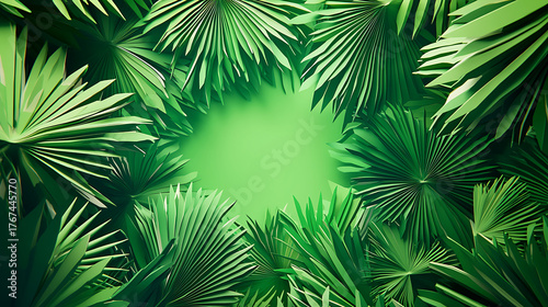 Fototapeta premium Lush green palm leaf background framing a vibrant central space, ideal for...