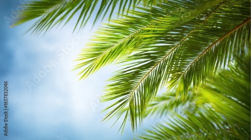 Fototapeta premium Lush Green Palm Leaves Against a Bright Blue Sky: A Tropical Paradise Vibe
