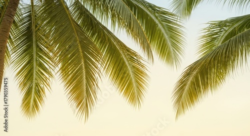 © Biggy, Naklejka premium Lush Green Palm Leaves Against a Soft Colorful Sky at Sunset Dual Composition