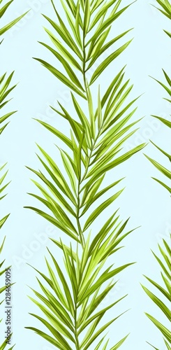 © gulmemmed, Naklejka premium Lush Green Palm Leaves Arranged in a Seamless Pattern on a Light Blue Background in a Decorative Design Perfect for Textiles and Wallpapers