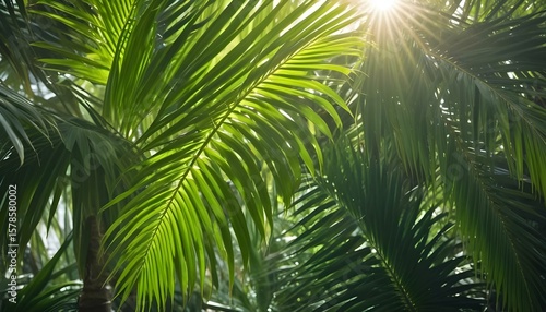 Fototapeta premium Lush green palm leaves bask in the sunlight, creating a serene tropical scene.