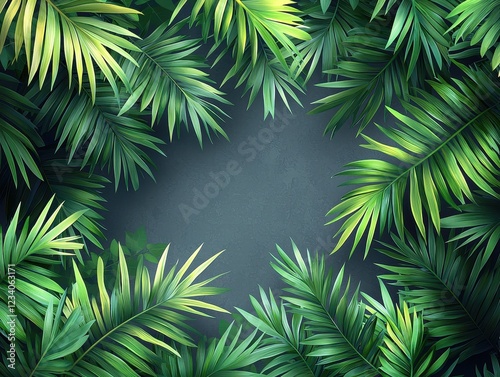 Obraz premium Lush green palm leaves framing a dark background for design purposes.