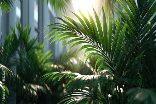 © Garik, Fototapeta premium Lush green palm leaves illuminated by sunlight in a bright greenhouse during the day