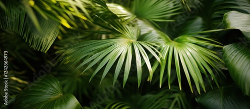 Fototapeta premium Lush green palm leaves in tropical garden, sunlight dappled background,...