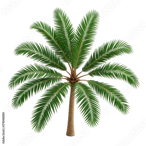 © Daru, Fototapeta premium Lush, green palm tree with a brown trunk, isolated on black