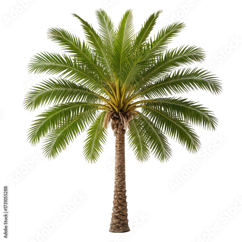 © Bra, Fototapeta premium Lush green palm tree with a textured trunk on a black background