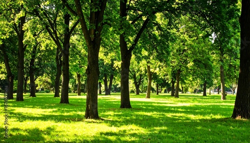 Fototapeta premium Lush green park with sunlight filtering through trees