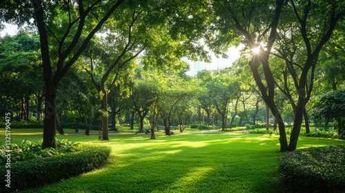 © ALIS ST, Fototapeta premium Lush Green Park with Sunlight Filtering Through Trees in Urban Setting