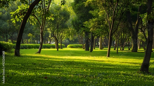© virza, Obraz premium Lush green park with vibrant trees and sunlight streaming through the foliage
