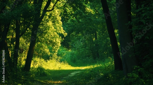 © Faizer, Obraz premium Lush Green Pathway in Vibrant Forest Light