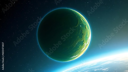 Fototapeta premium Lush green planet floating in space with a glowing atmosphere, depicting...