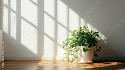 Fototapeta premium Lush green plant in white pot, sunlight through window casting shadows on white wall and wood floor.