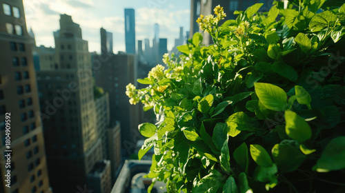 Obraz premium Lush Green Plant Life in Urban Rooftop Garden with City Skyline