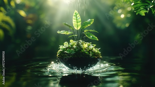 Naklejka premium Lush green plant sprouting from a sphere floating on water, sunlight shining...