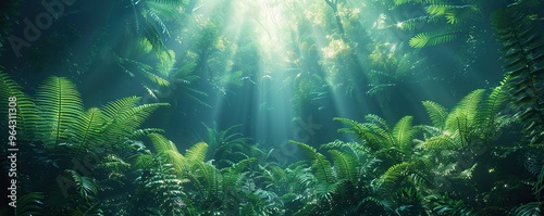 Obraz premium Lush Green Rainforest Canopy with Sun Rays Piercing Through