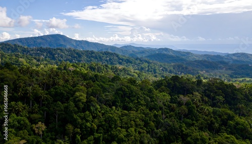 Fototapeta premium Lush green rainforest foliage covers rolling hills, stretching to distant mountain ranges under a light, partly cloudy sky.