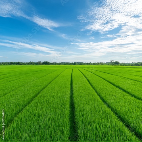 © Manganese, Naklejka premium Lush Green Rice Field Divided into Perfect Squares Under Clear Sky