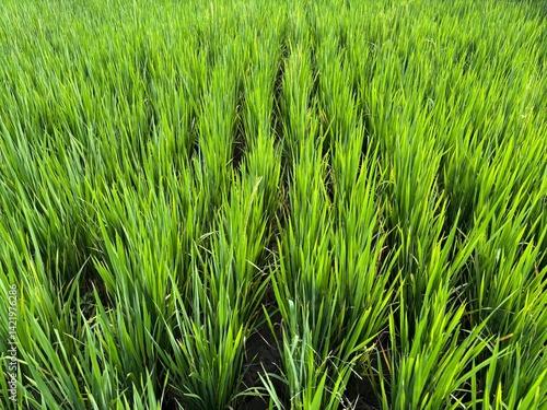 © Danang, Obraz premium Lush Green Rice Field in Rural Area under Blue Sky – Peaceful Agricultural Landscape in yogyakarta, Indonesia, Perfect for Farming, Nature, and Countryside-Themed Projects, Yogyakarta, Indonesia