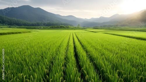 Naklejka premium Lush green rice field under a clear sky, surrounded by majestic mountains,...