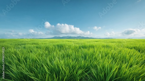 © buraratn, Obraz premium Lush Green Rice Field Under Clear Blue Sky with Distant Mountains and Fluffy White Clouds in Bright Daylight