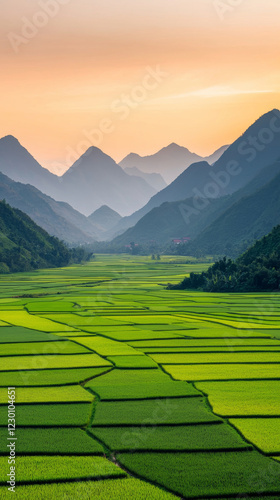 Fototapeta premium Lush green rice fields stretch across valley surrounded by mountains at sunset