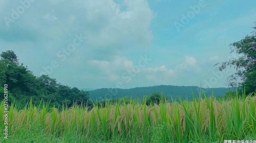 Naklejka premium Lush Green Rice Fields Under Blue Sky with Fluffy Clouds