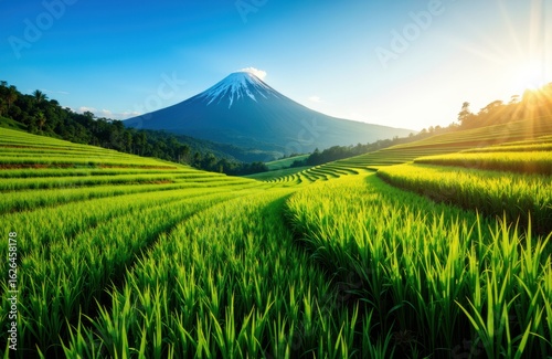 © starush, Fototapeta premium Lush green rice fields with Mount Fuji in the background during sunrise
