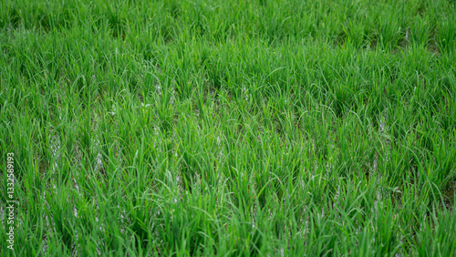Obraz premium Lush green rice fields with thriving rice plants in the countryside,...