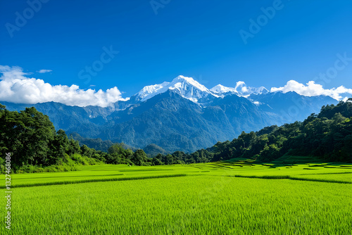 © MOCHAMAD, Obraz premium Lush green rice paddies stretch beneath snow-capped mountains