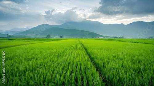 © Ariep, Naklejka premium Lush Green Rice Paddy Field Under a Cloudy Sky