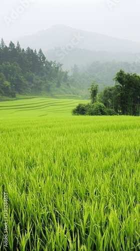 © Kencang, Obraz premium Lush Green Rice Paddy Field with Misty Mountains in the Background