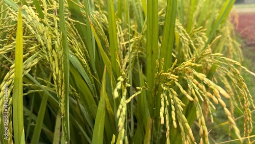 Fototapeta premium Lush green rice paddy nearing harvest.