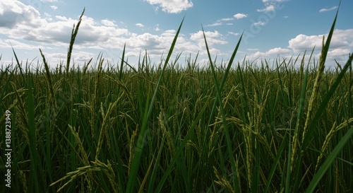 © edit, Fototapeta premium Lush Green Rice Paddy Under a Partly Cloudy Blue Sky, Rural Agriculture Landscape